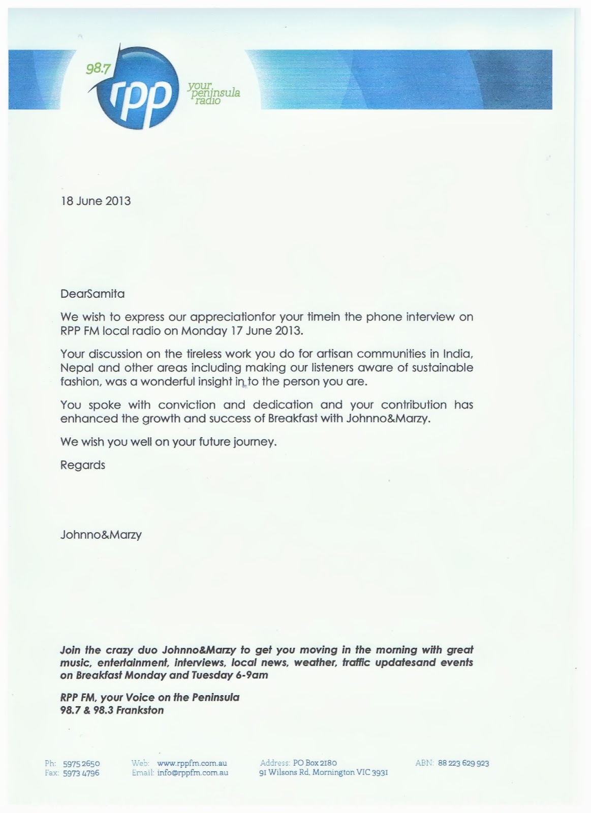 Listen to Samita on Breakfast with Johnno & Marzy on Monday 17 June at 8.15am on 98.7FM and 98.3FM Frankston, your Voice on the Peninsula. You can stream live from the websiterppfm.com.au